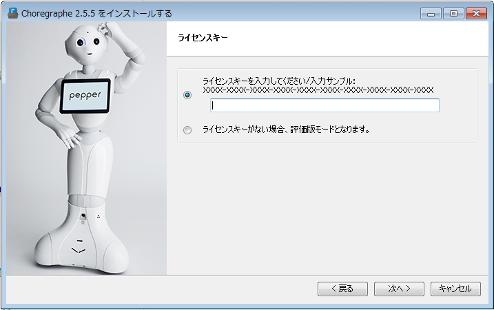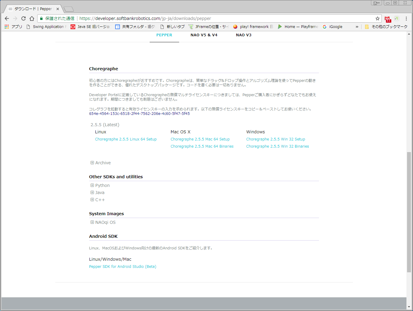 (3)ロボットを選択(PEPPERを選択)すると、画面中央下にChoregrapheのライセンスキーとダウンロードリンクが表示されます。私の環境はWindowsなので、「Choregraphe 2.5.5 Win 32 Setup」をダウンロードしました。