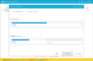 [実行]をクリックすると、「ターゲットディスクのデータが消去されますが、本当に継続しますか?」というダイアログが表示されます。[OK]をクリックすると、クローン作成が実行されます。