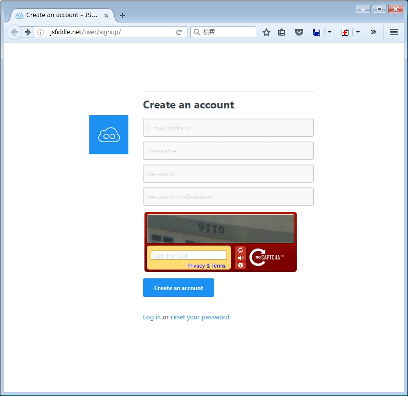 メールアドレス、ユーザー名、パスワードを入力し、下の赤い所の写真に写っている番号を、その下のテキストボックスに入力してから[Create an account]をクリックします。
