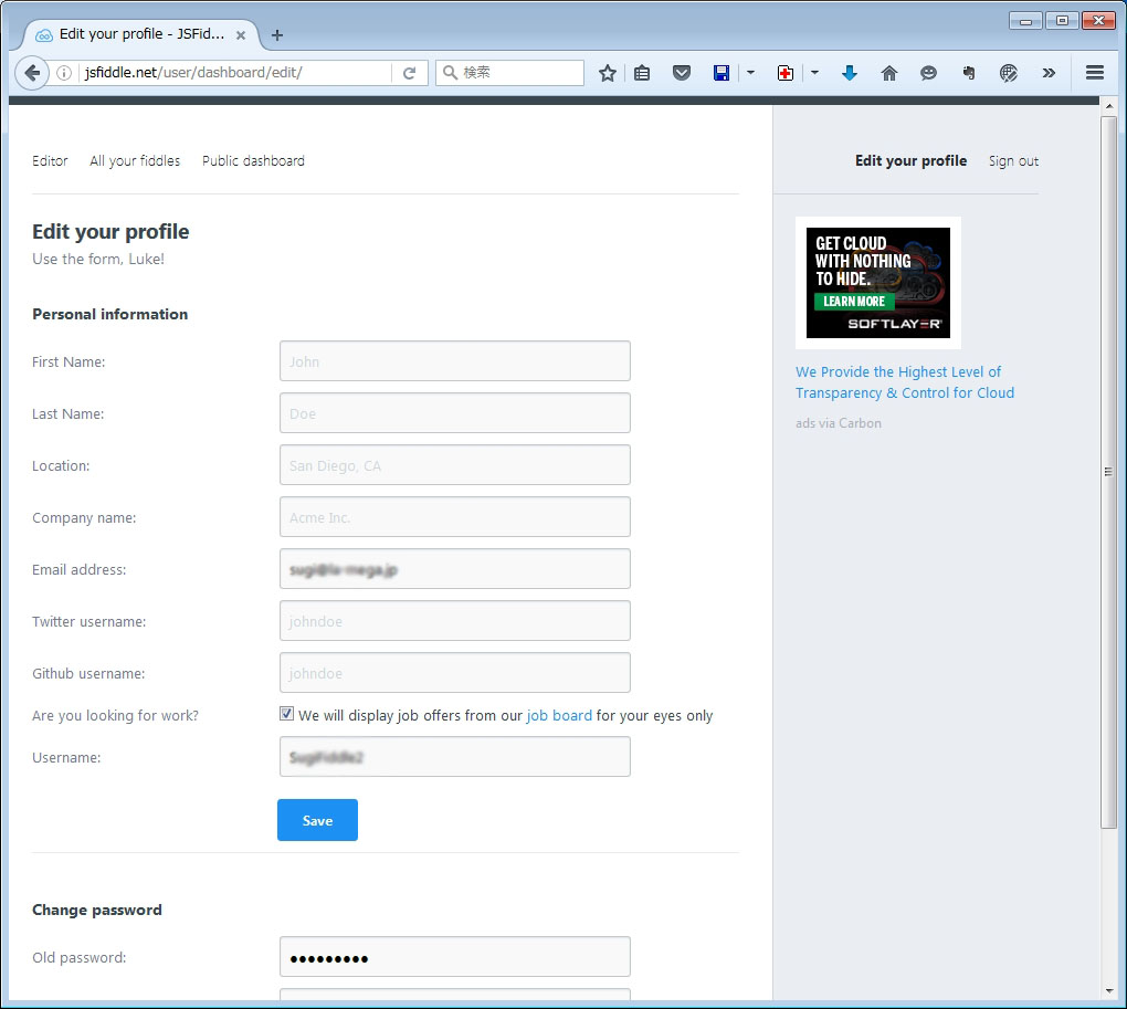 まず、jsFiddleにログインしておきます。