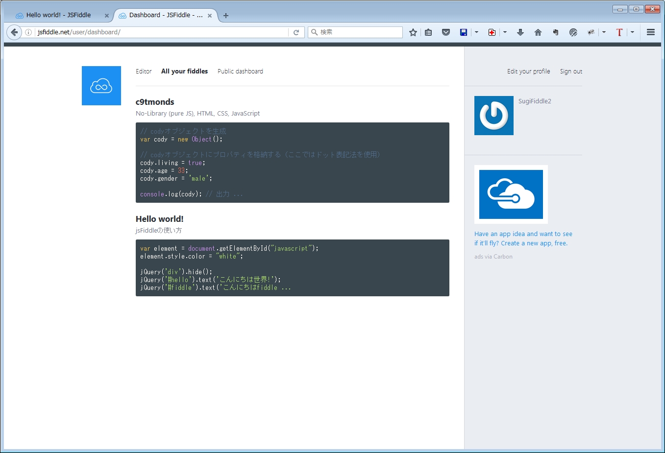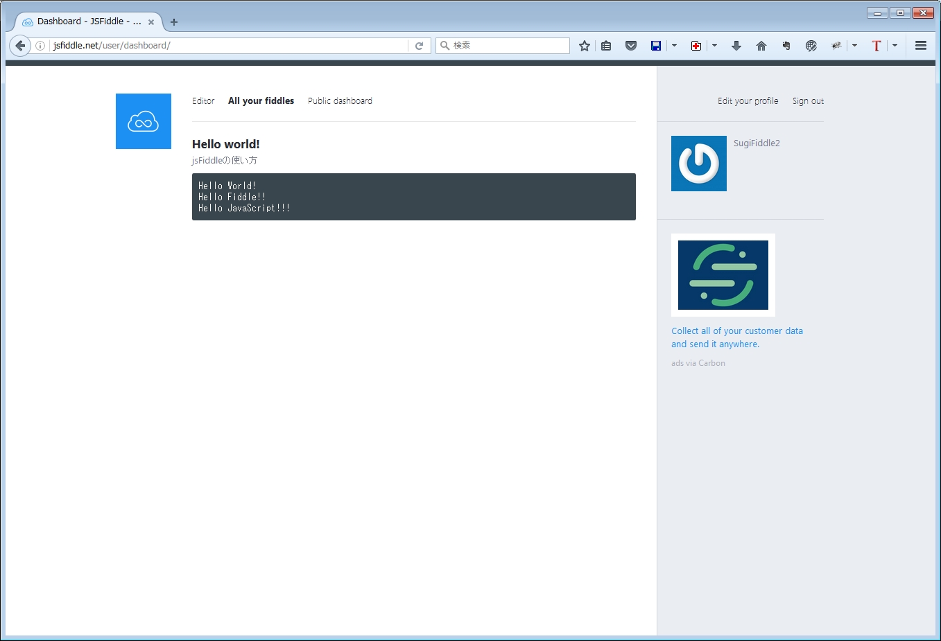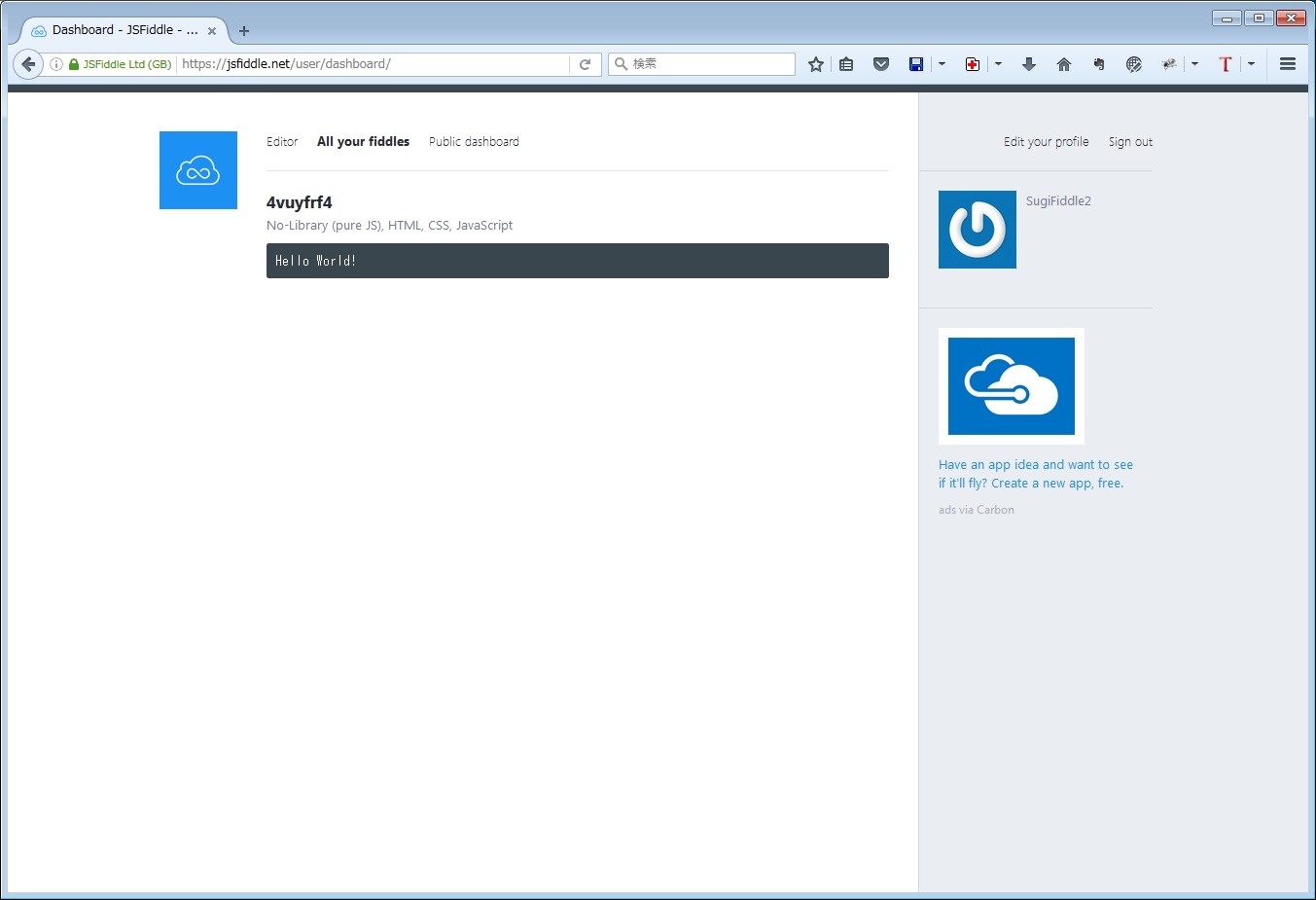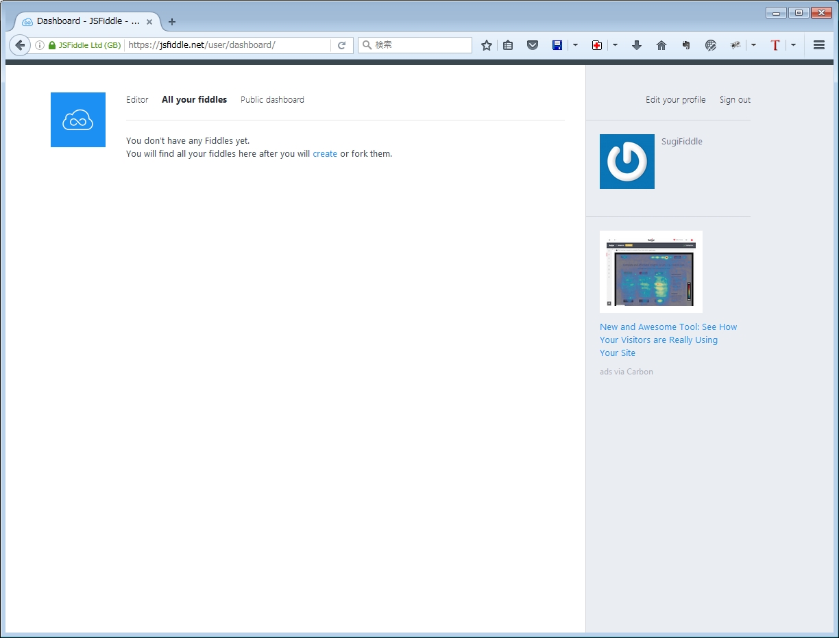 プロフィールを入力する画面ですが、何も入力しなくても大丈夫なので、上部メニューの「All your fiddles」をクリックすると、下記の画面になります。