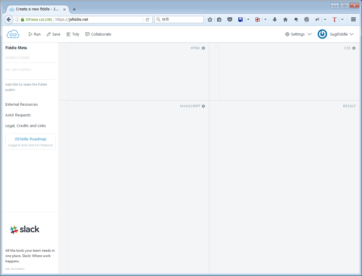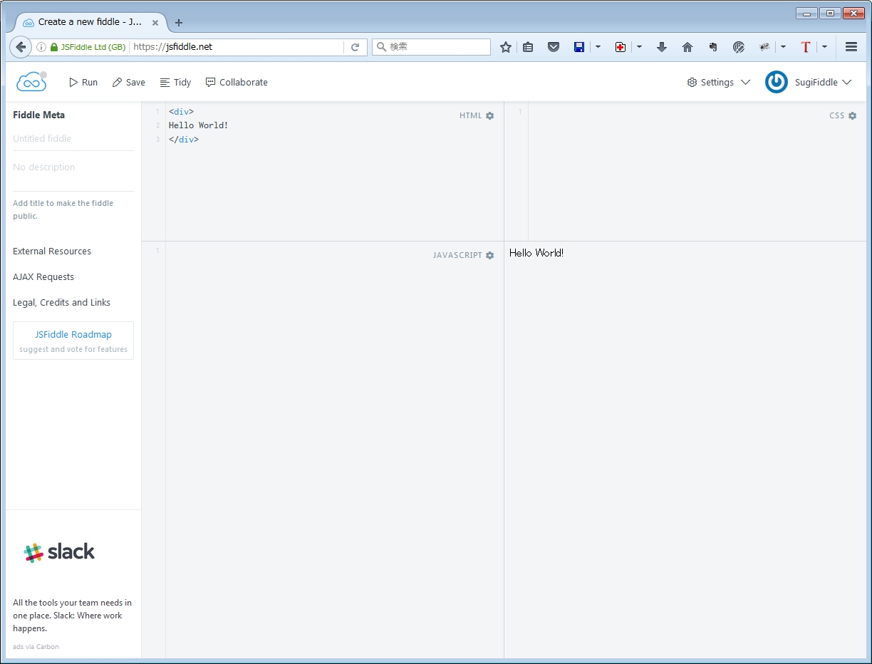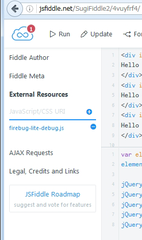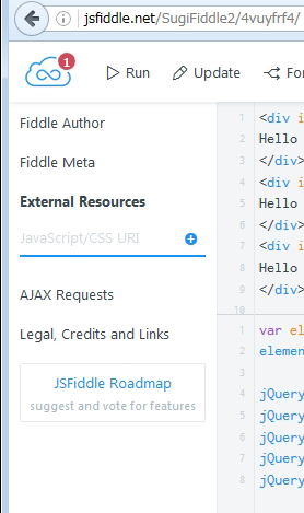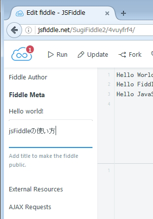 jsFiddleは、JavaScriptの動作をオンラインで確認できるエディタだそうです。