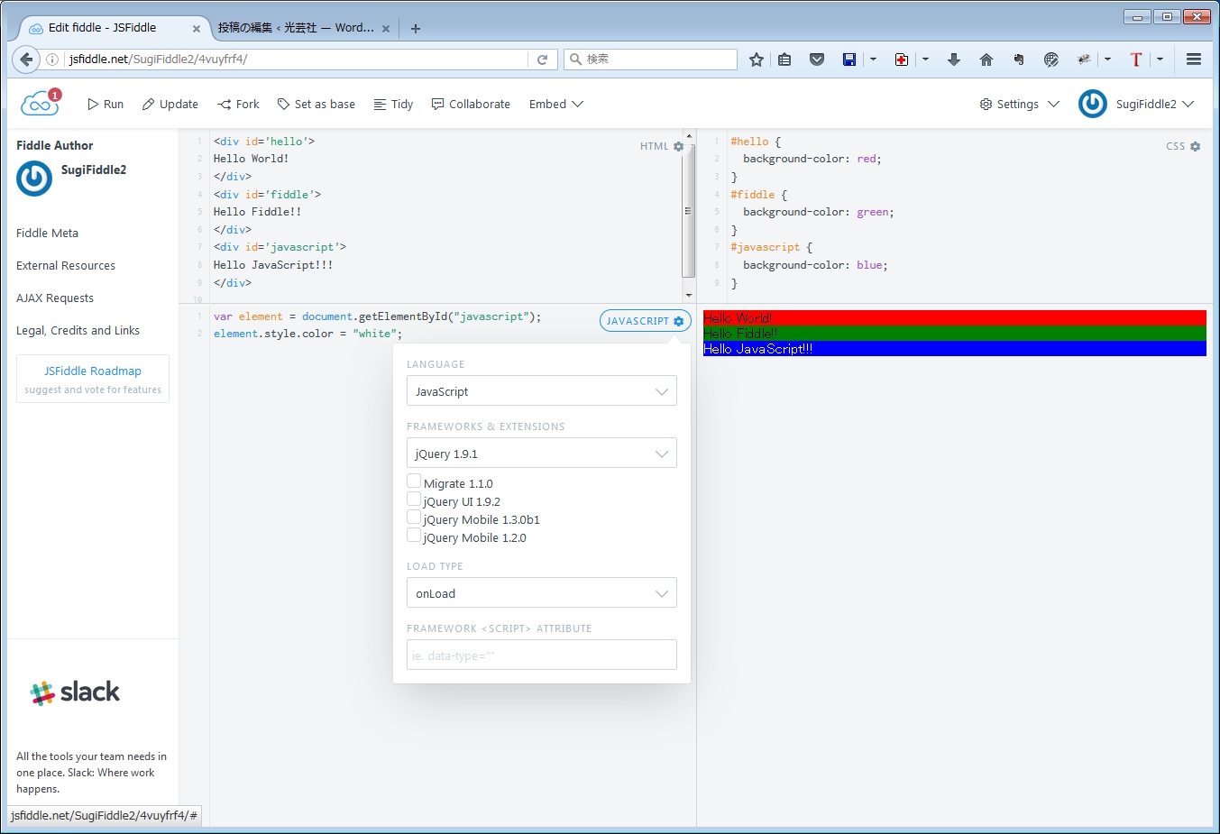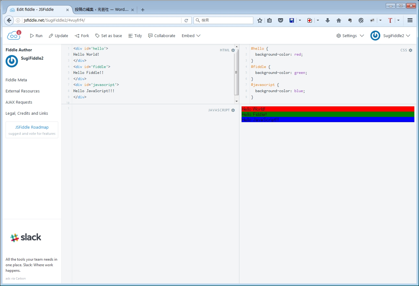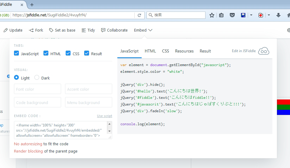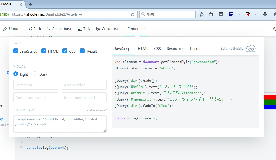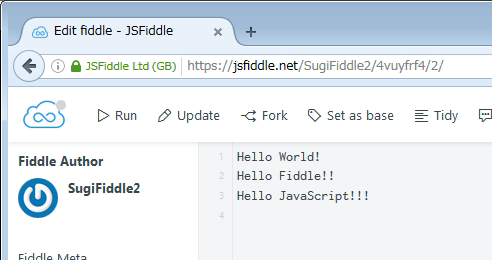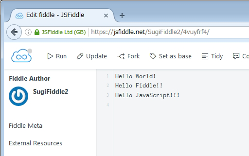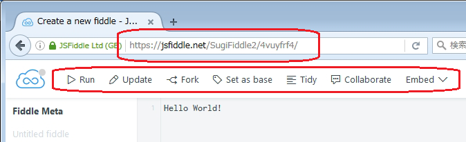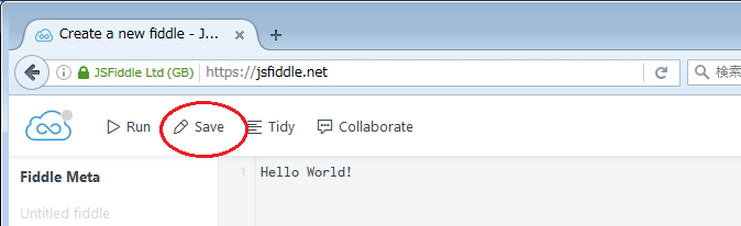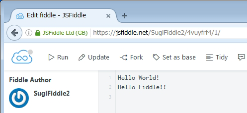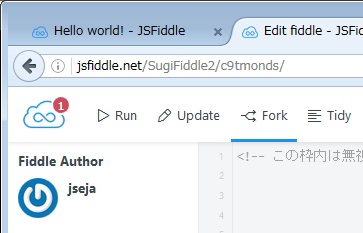 この段階ではURLは、https://jsfiddle.net/[ユーザー名]/4vuyfrf4/2/ になっています。