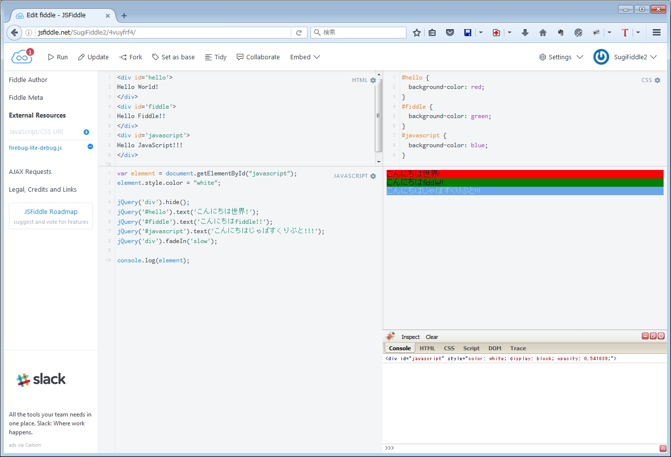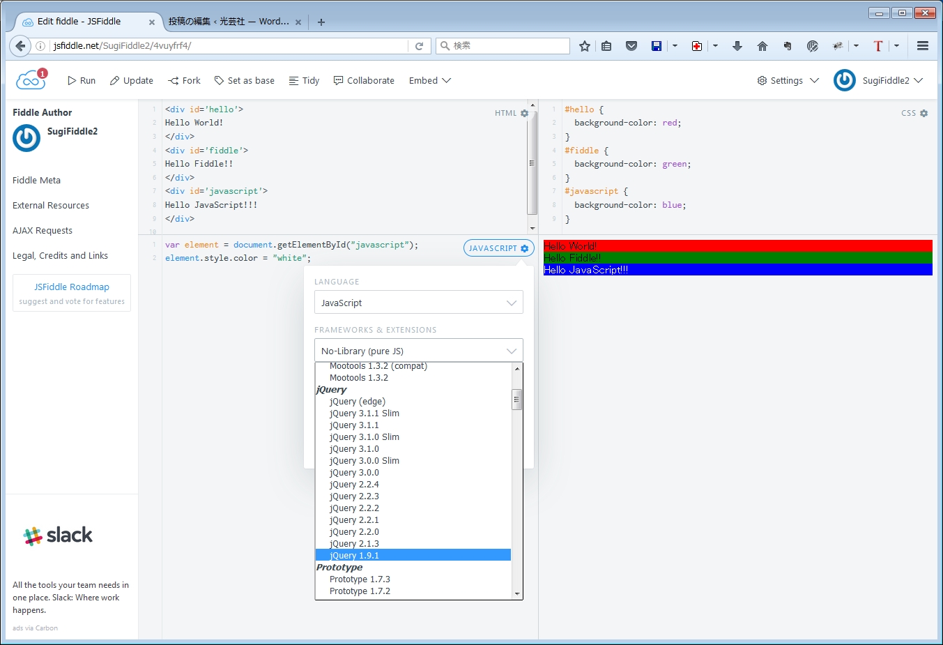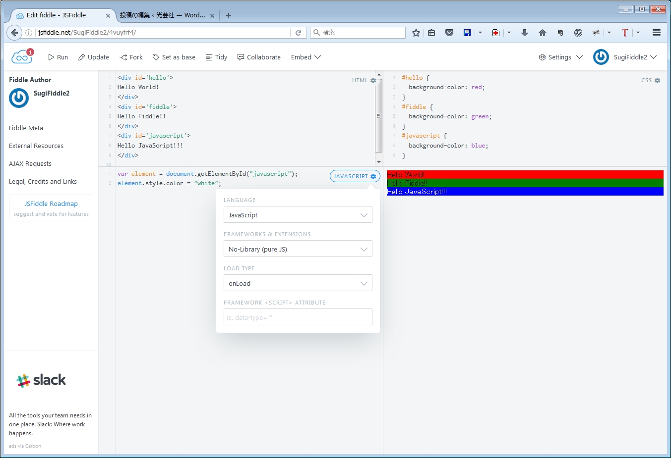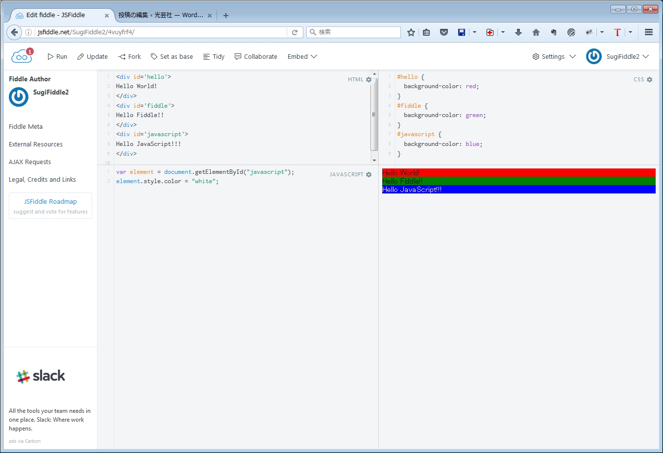 この段階ではURLは、https://jsfiddle.net/[ユーザー名]/4vuyfrf4/2/ になっています。
