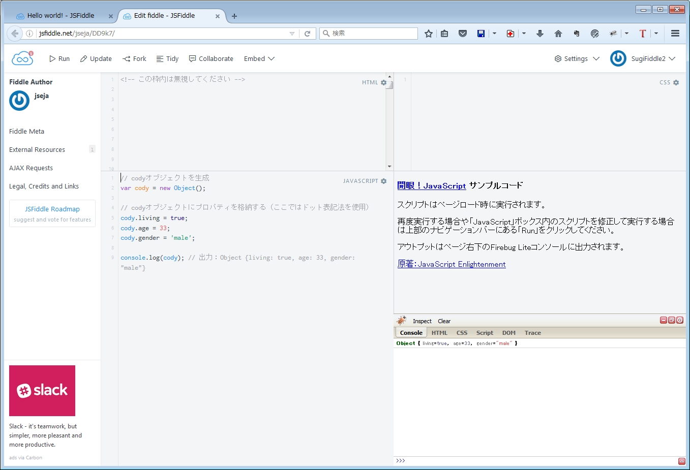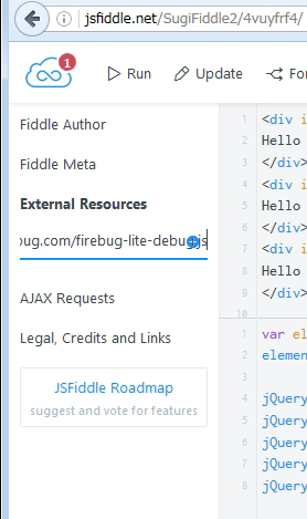 JavaScriptをもっと学ぼうと、「開眼! JavaScript ―言語仕様から学ぶJavaScriptの本質」という本を入手したところ、この本のサンプルコードは、「jsFiddleを使ってfirebug-lite-devをプラグインとして含めた環境で公開しています」とありました。