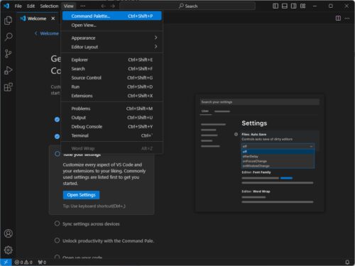 Visual Studio Codeを起動し、上部メニューから[View]-[Command Palette…]を選択します