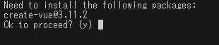 create-vueパッケージをインストールするかどうかの問い合わせなので、「y」と入力してエンターキーを押してください。2回目以降、このメッセージは表示されません。