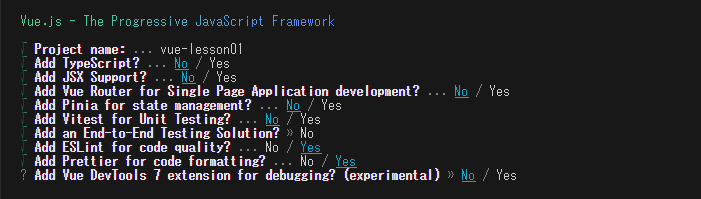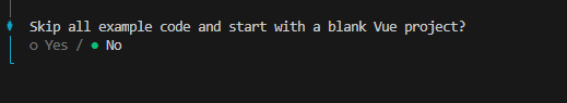 「すべてのサンプルコードをスキップして、空白のVueプロジェクトから始めますか?」と聞かれます。とりあえず動作を確認したいのでサンプルコードを生成するように「No」を選択しておきます。