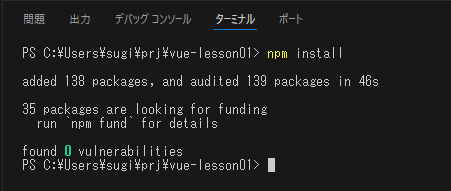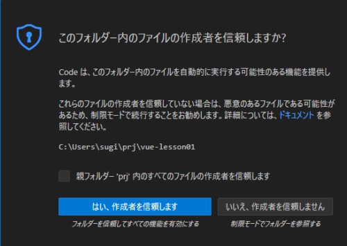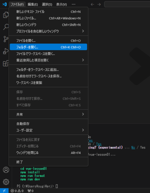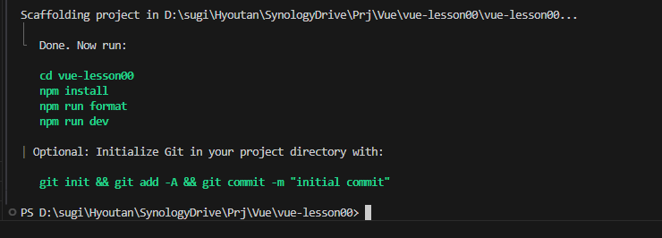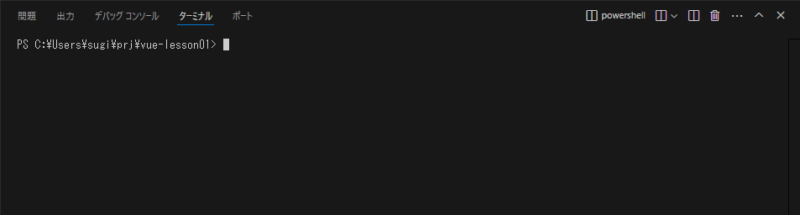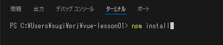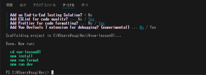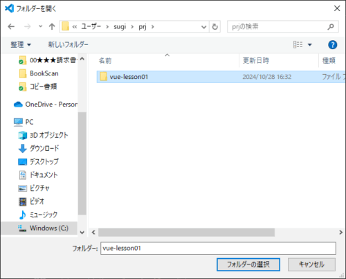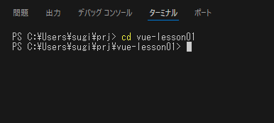 ここでは、「C:Users[ユーザー名]prj」というフォルダを作成し、このフォルダの中に「vue-lesson01」というプロジェクトを作成しようと思います。