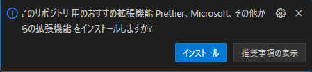 拡張機能のインストールを聞いてきたら、拡張機能はあとでまとめてインストールしますので、とりあえずここでは[X]でダイアログを閉じておきます。