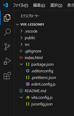 左端のエクスプローラーに作成されたフォルダ・ファイルが表示されます。