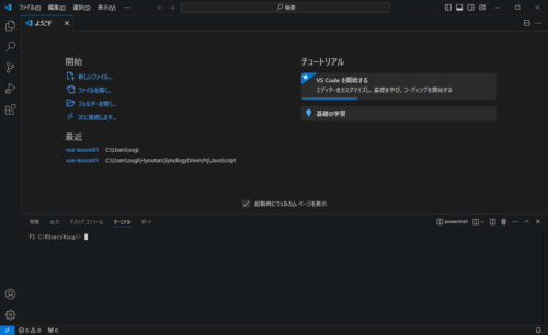 フォルダを開いてからターミナルを開いたので、カレントフォルダがプロジェクトフォルダになっています。