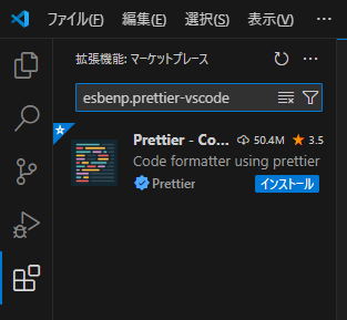 | esbenp.prettier-vscode | prettierをVSCode上のフォーマッターとして使い、ファイル保存時に自動的にフォーマット(整形)してくれます。 |
