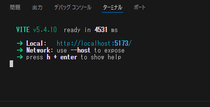ターミナルでコマンド「npm run dev」を実行します。