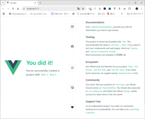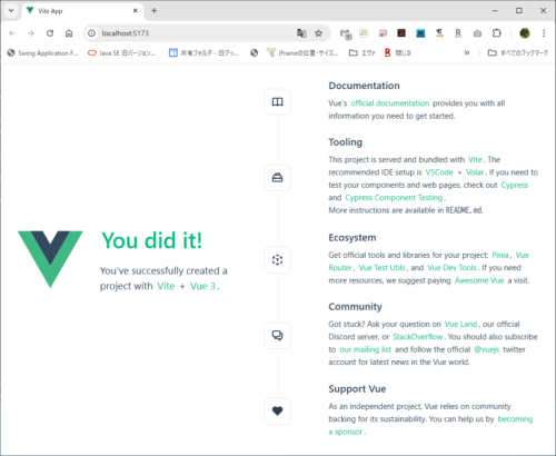 これで一応Vue.jsを動かす環境が出来、スタート地点に立てました。