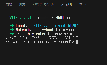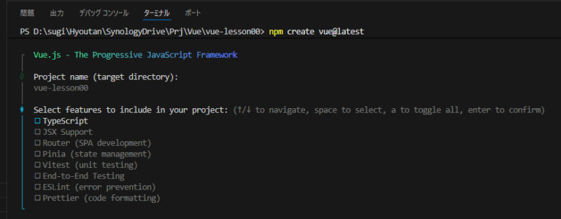 ターミナルで、コマンド「npm create vue@latest」を実行します。