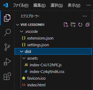 「dist」というフォルダが出来、この中にリリース用のファイルが作成されます。
