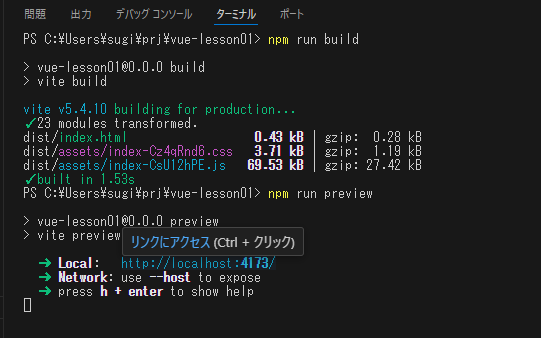 ターミナルで「npm run preview」を実行すると、サーバーが起動し「dist」の中身がブラウザで表示されます。