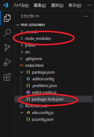 エクスプローラーを見ると「node_modules」というフォルダと「package-lock.json」というファイルが増えています。