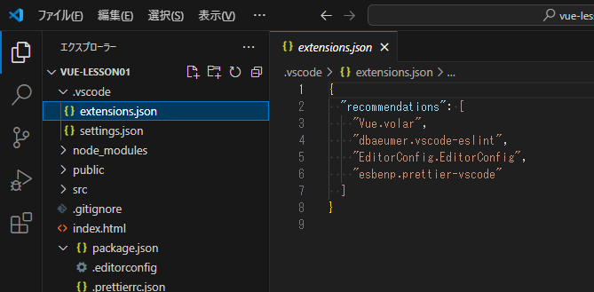 「npm create vue@latest」で作成されたファイルに、extensions.jsonというファイルがあります。